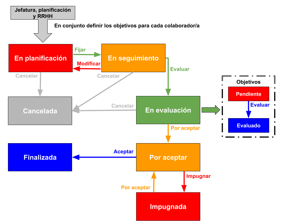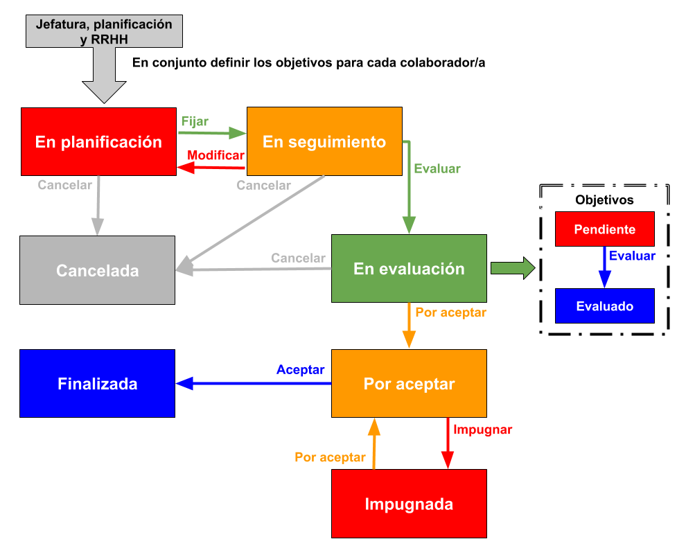 - En evaluación: además de seguir añadiendo documentación se procede a evaluar cada uno de los objetivos por separado. Dependiendo del tipo de criterio puede ser evaluado por el supervisor del colaborador/a, el propio colaborador/a o los subalternos del colaborador/a.