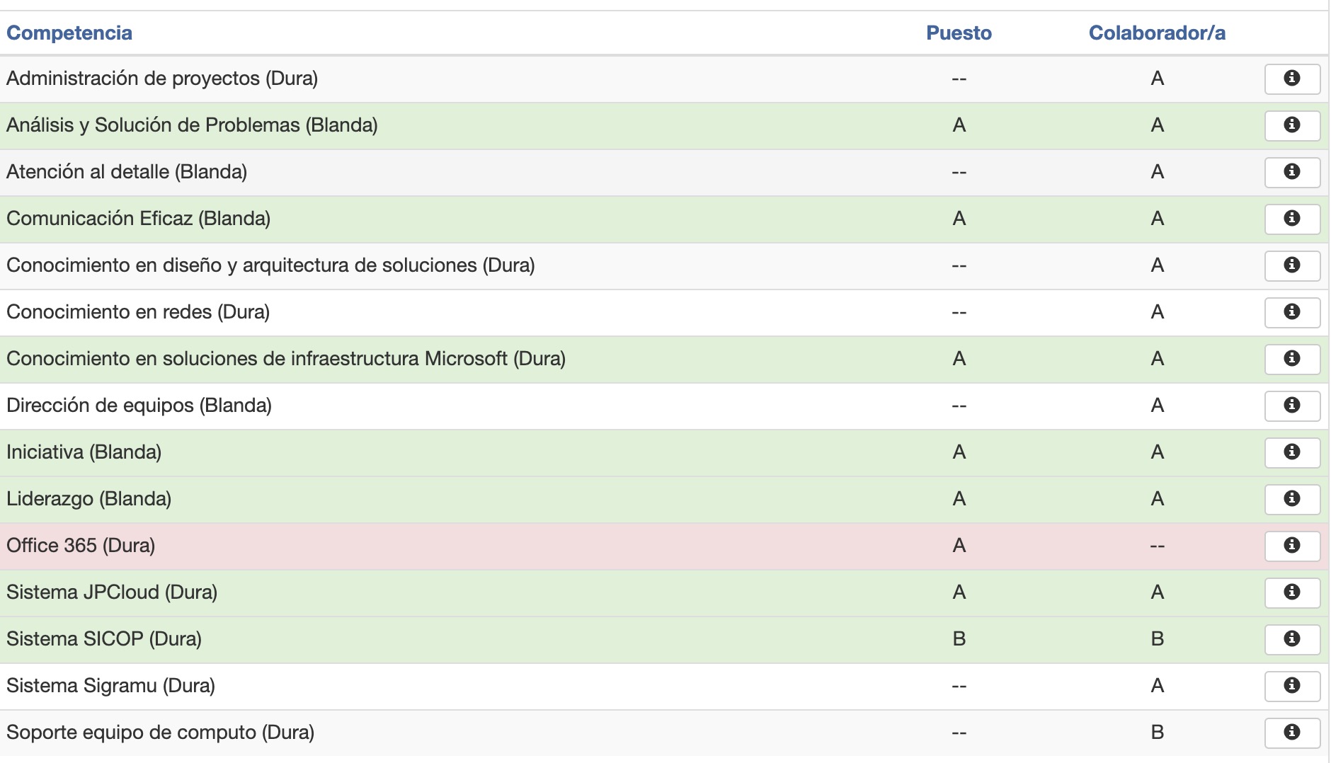 Los colaboradores tienen asignado un puesto del catálogo, y los niveles de competencias que les correspondan. De forma que al crear la evaluación de desempeño está información está disponible, pudiendo ver claramente que columna le corresponde en la tabla de ponderación, y ofreciendo un análisis de competencias entre el puesto y el colaborador.