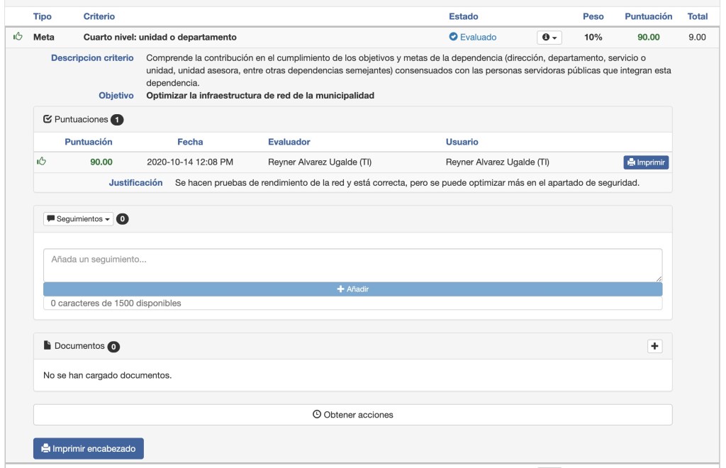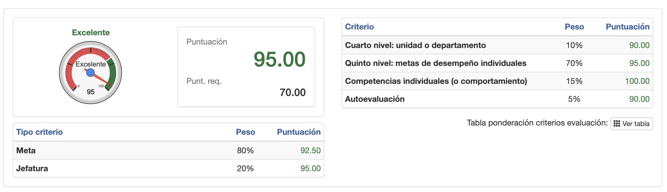 Al realizar la evaluación el sistema muestra el detalle de la puntuación otorgada de forma individual para cada objetivo como de forma agregada.