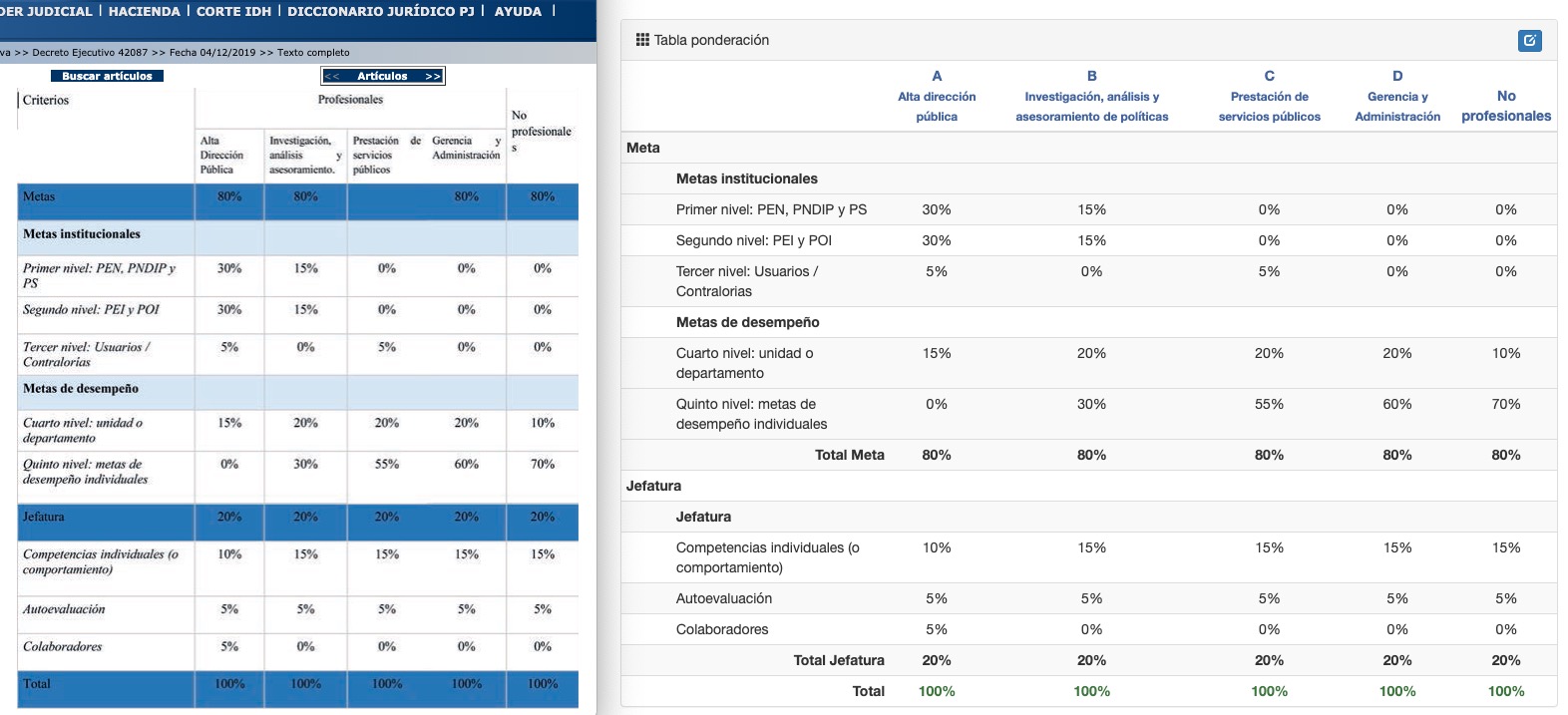 Los pesos de los objetivos de cada evaluación debe sumar 100, y su distribución entre los diferentes tipos de criterios depende del puesto del colaborador/a (si es profesional o no, y de su familia), esto se define mediante la «Tabla de ponderación de los criterios de evaluación según la familia de los puestos»